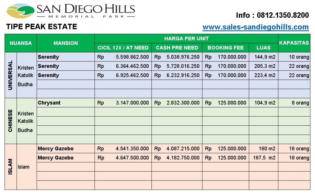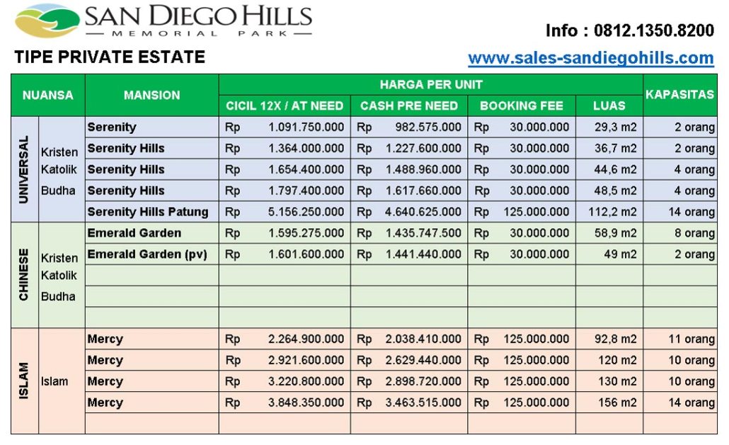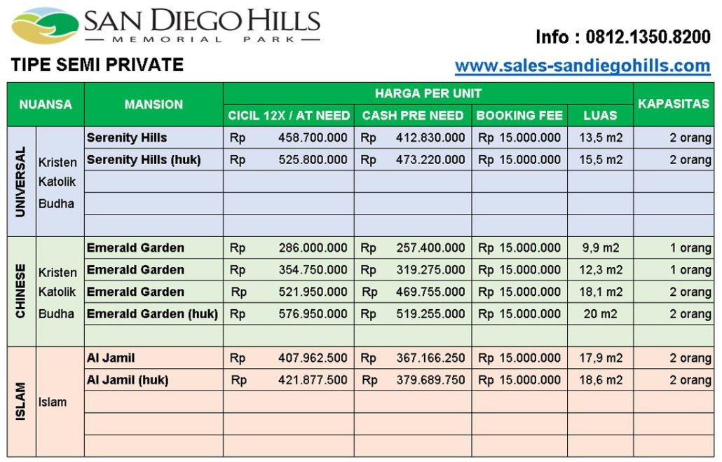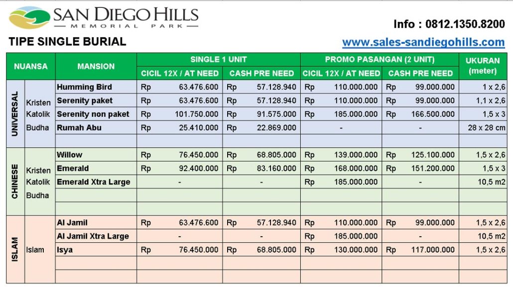 Berikut ini daftar harga pemakaman San Diego Hills tergantung tipe makam dan nuansa: