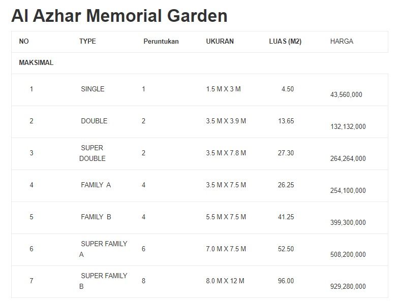 Areal pemakaman ini memiliki harga berbeda tergantung pada tipenya. Untuk lahan ukuran Single seharga Rp27.360.000. Kemudian ada paket Gold-Gold seharga Rp35,9 juta dan paket Platinum seharga Rp39,9 juta.