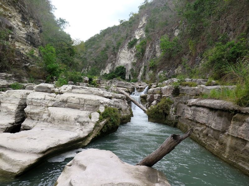 Kalian harus berjalan kaki melewati perkebunan penduduk sebelum akhirnya tiba di air terjun dengan lansekap memanjang seperti sungai. Di kiri kanan berupa tebing tinggi dan di sekitar sungai berupa lubang-lubang yang akan terisi air ketika air sungai sedang tinggi. Setiap sisi air terjun ini memiliki pemandangan yang berbeda.