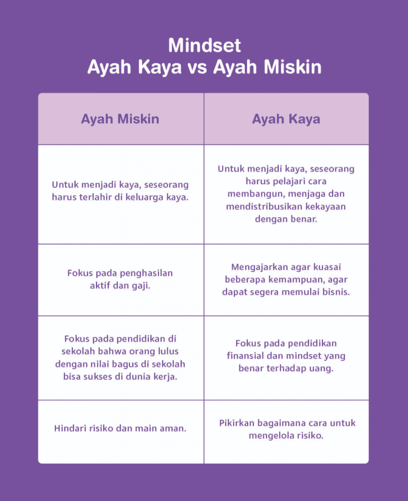 Meski demikian, kedua ayah tersebut punya cara pandang yang berbeda satu sama lain terkait pengelolaan dan tujuan finansial. Ayah Kaya menyarankan agar Kiyosaki berani mengambil risiko membangun usaha dan menjadi investor setelah lulus dari sekolah agar mampu mencapai kebebasan finansial.