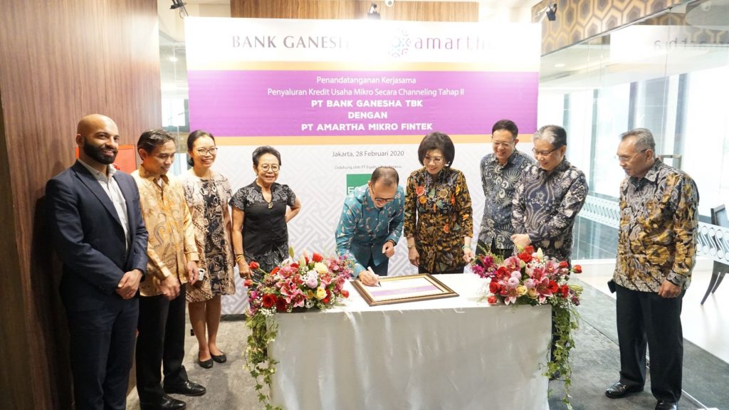 Jakarta, 28 Februari 2020 - PT Amartha Mikro Fintek atau Amartha perkuat kerjasama dengan PT Bank Ganesha Tbk dalam penyaluran kredit usaha mikro secara channeling tahap II. Sinergi ini ditandai dengan penandatangan kerjasama oleh Aria Widyanto, Chief Risk and Sustainability Officer Amartha dan Lisawati, Presiden Direktur Bank Ganesha yang disaksikan oleh perwakilan dari World Bank Washington DC di Jakarta Pusat pada Jumat (28/02).